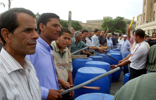 عمال شركة غزل المحلة يقرعون الطبول مطالبين بأجر عادل وتطبيق وعود الرئيس مبارك أثناء اليوم السادس للاضراب الذي شارك فيه آلاف العمال، مصنع غزل المحلة، 28 سبتمبر 2007