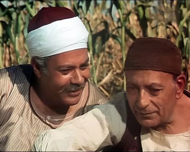 محمود المليجي ويحيى شاهين، من فيلم الأرض، تأليف عبد الرحمن الشرقاوي، وإخراج يوسف شاهين، إنتاج 1970.