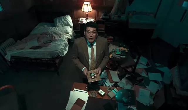 تخترق كاميرا المخرج العين السحرية، وتغوص داخل الشقة إلى أن تصل إلى غرفة نوم، ونرى عصام عمر/عادل، الذي يقف مشدوهًا مصوبًا ناظريه إلى جثتين لرجل وامرأة شبه عاريين ملطختين بالدماء، ثم تنسحب الكاميرا في مسار معاكس لتخرج من العين السحرية، وفي لحظة الخروج تتحول العين إلى كاميرا مراقبة حديثة في محل تجاري، في فلاش باك ذكي وخاطف، حيث نجد عادل بطل العمل مرة أخرى في حال أخرى، ممسكًا بالكاميرا ويتحدث مع صاحب المحل عن جودة الصورة.