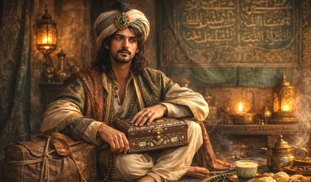 جلس أمير فدنت منه فتاة تقرب له الكعك والفطائر، فأخذ عددًا لا يستهان به منها، ووضعه في حجره، ثم سأل الفتاة عن مشروب. سألته بصوت رقيق إن كان يفضل الشاي بالزعفران أم اللبن المحلى بالعسل، فأجاب بأنه يفضل الأخير لو أنها زينته ببعض الزعفران. أومأت وهي تمسك بطرف عباءتها لتغطي بها ذقنها وشفتها السفلى وتبتسم. كان أمير جائعًا فالتهم الفطائر والكعك قبل أن تحضر له الفتاة المشروب الذي طلبه. نظرت إليه وفمه مملوء بآخر كعكة كانت في حجره، فوضعت الطبق أمامه وأشارت بيدها وهي ما زالت تغطي ذقنها بطرف عباءتها "كل.. أنت جائع".