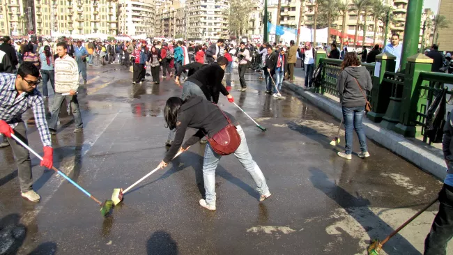 وفي اليوم التالي مباشرة، ظهرت مجموعات "شباب بتحب مصر" تكنس الشوارع والأرصفة في تعبير رمزي عن انتهاء الاعتصام. رغم ذلك، استطاعت مجموعة صغيرة البقاء في التحرير، لكن بلا تأثير، وصُنِّف أفرادها كمتطرفين. ابتهج الناس في تلك الأيام، وحقّ لهم كذلك، فالإنجاز عظيم، والإحساس بالقدرة على الفعل كان طازجًا ومُلهمًا. فللمرة الأولى منذ عقود، شعر كثيرون أنهم يستطيعون التنظيم والكلام والمبادرة بلا إذن.