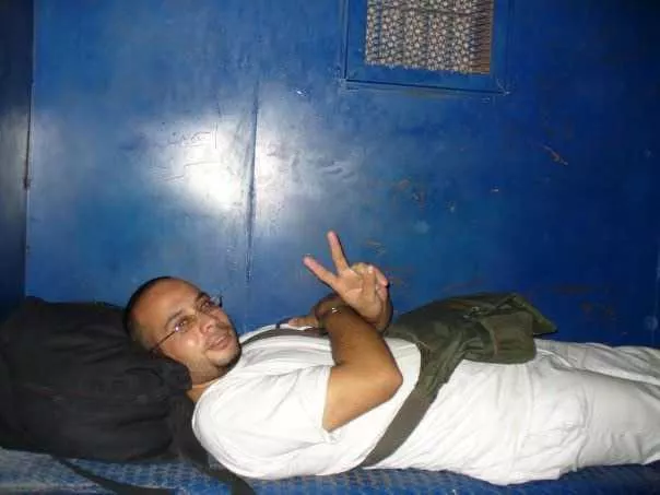 أحمد ماهر في سيارة الترحيلات في يوليو 2008 بعض القبض عليه على خلفية مظاهرات لحركة شباب 6 أبريل.